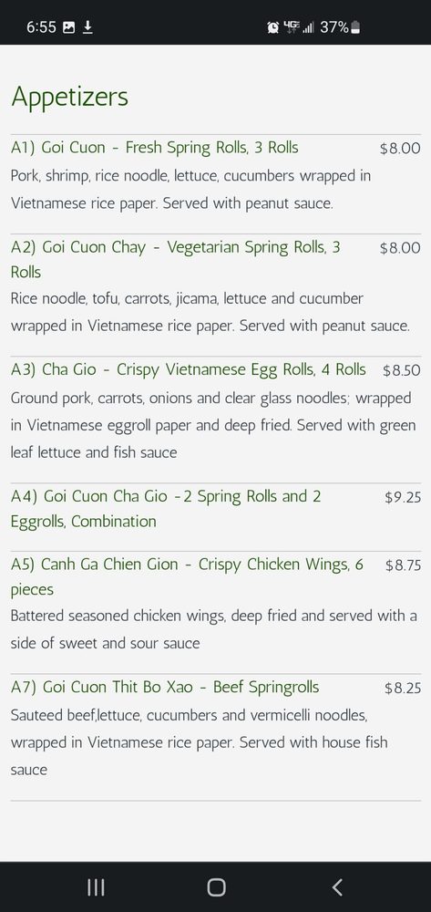 Crispy Vietnamese egg roll. 4 rolls. Ground pork, shrimp, chicken, carrots, onions and clear glass noodles; wrapped in Vietnamese eggroll paper and deep fried. Served with green leaf lettuce and fish sauce.