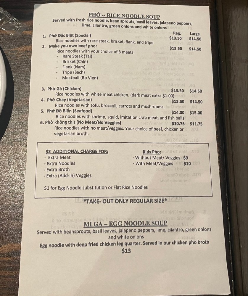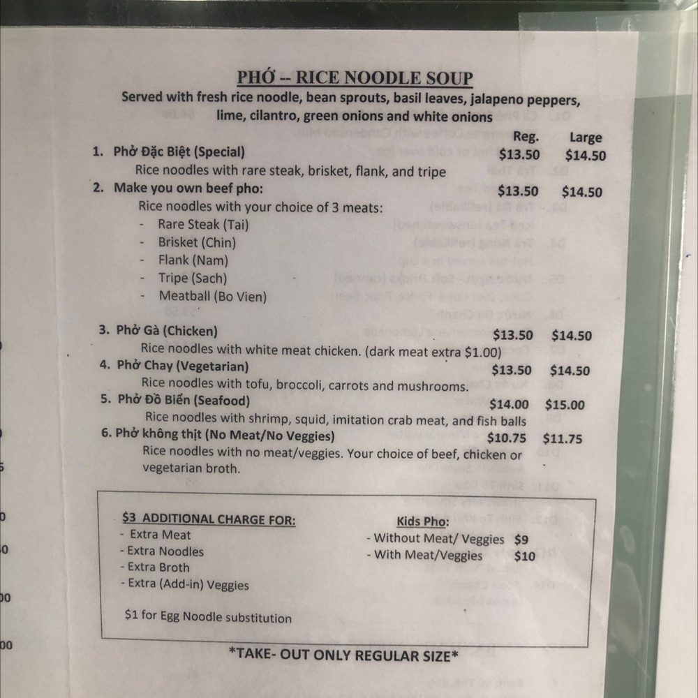 Just noodles and broth. No meat, no veggis. Rice noodles only. Your choice of beef broth, chicken broth or veggie broth.